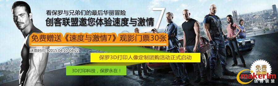 三維打印 > 3D打印資訊 > 創客聯盟邀請你免費觀看《速度與激情7》 ——看保羅與兄弟們的最后華麗冒險,送票活動 ...